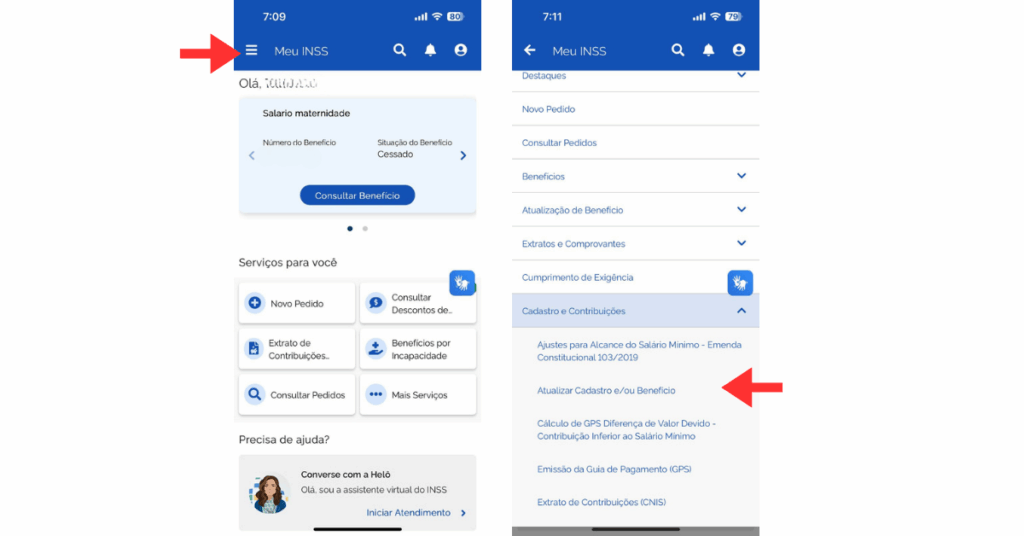 Na tela inicial, toque no ícone de três risquinhos” no canto superior esquerdo no menu principal. Escolha a opção” Cadastro e Contribuições” e em seguida “Atualizar Cadastro”.