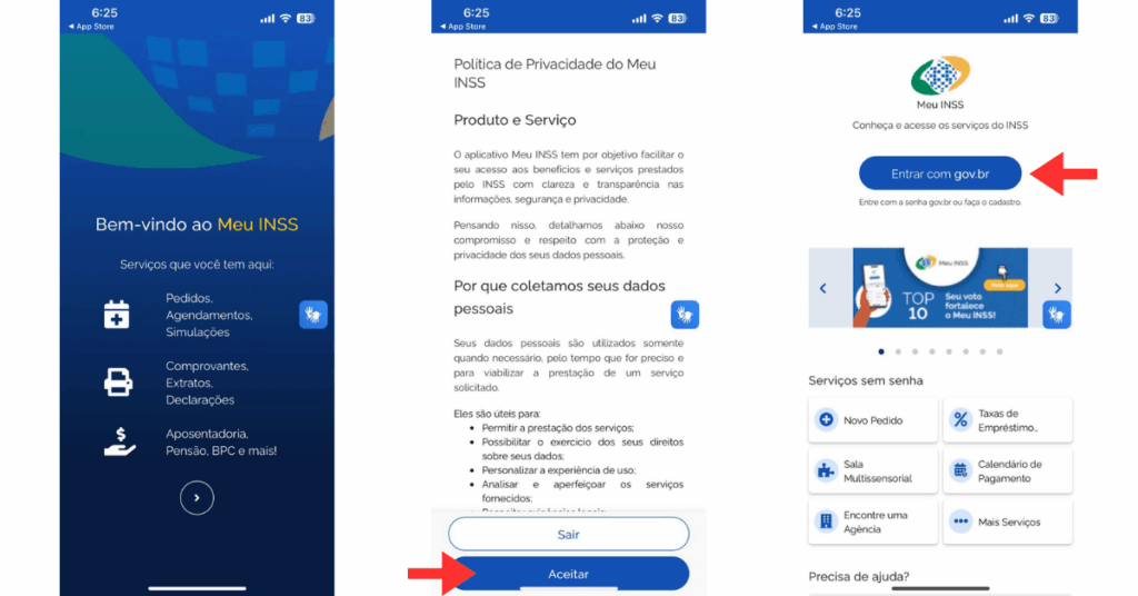 1️⃣ Abra o app Meu INSS, aceite a Política de Privacidade e toque em “Entrar com gov.br”.