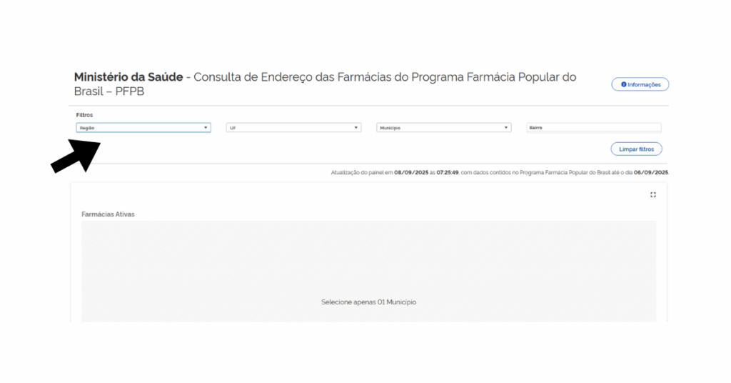3️⃣ Procure pela sua região inserindo: região, estado, município e bairro → o sistema vai exibir todas as farmácias cadastradas próximas a você.