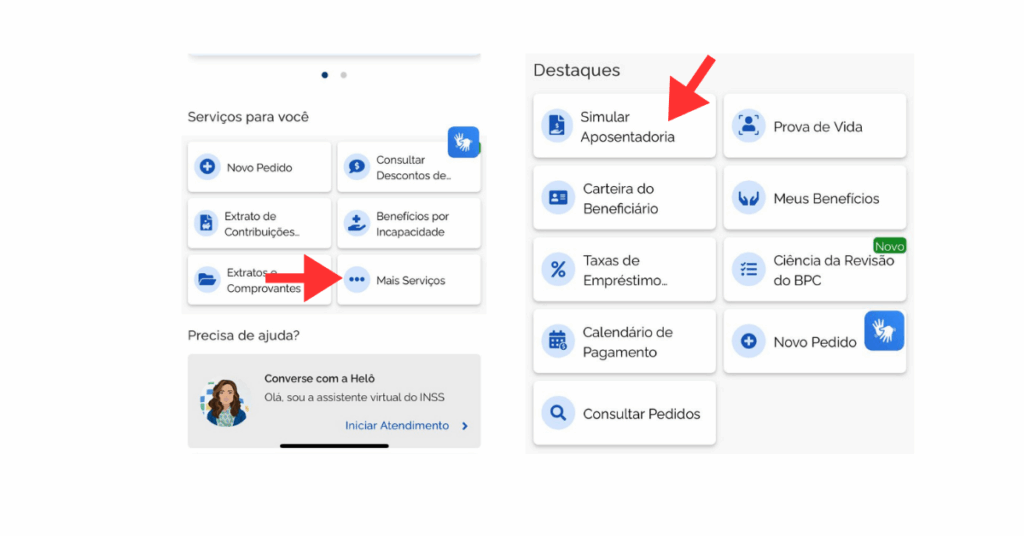 3️⃣ No menu principal, escolha a opção “Mais Serviços” e em seguida “Simular Aposentadoria”.