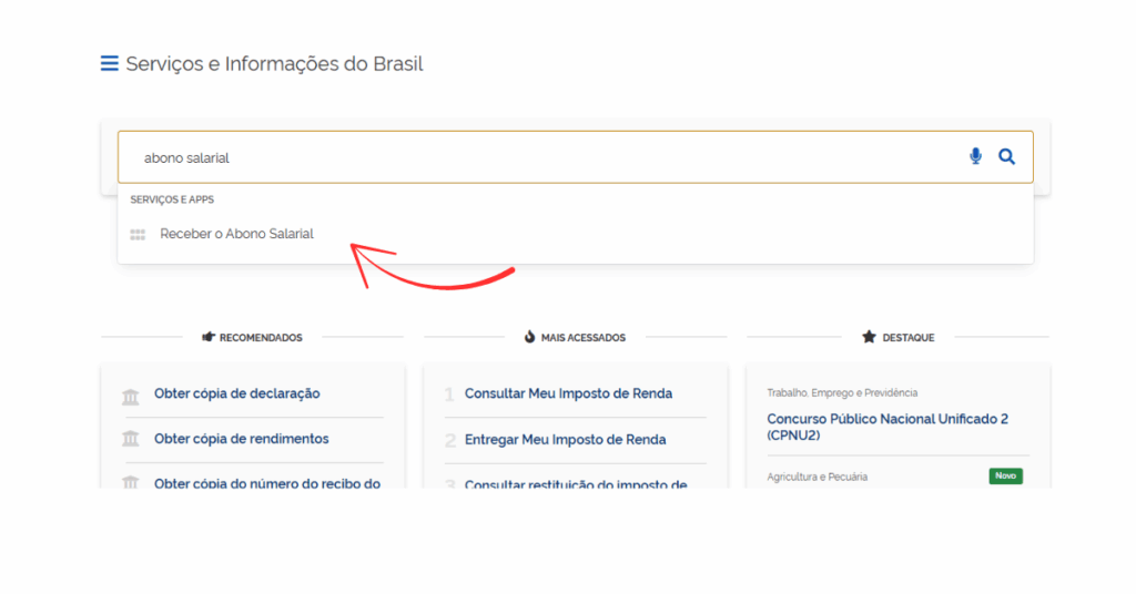 👉 Digite “abono salarial” na busca e em seguida, clique em “Receber Abono Salarial”.