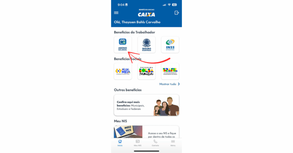 3️⃣ No menu, clique em “Benefícios” e depois em “Abono salarial”.